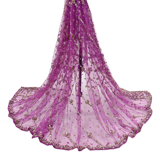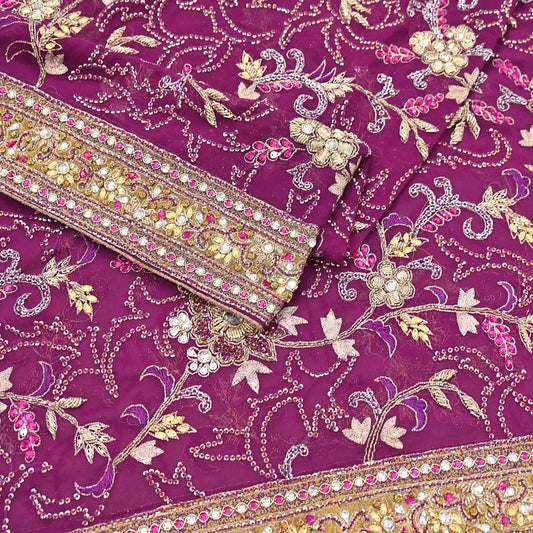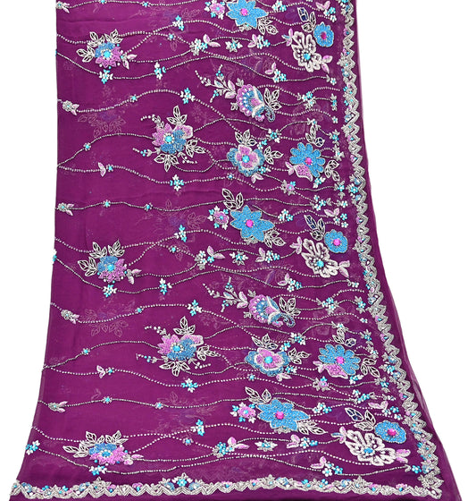 Indian Vintage Heavy Purple Dupatta Pure Georgette Silk Long Stole Hand Embroidered Scarf Zari Zardozi