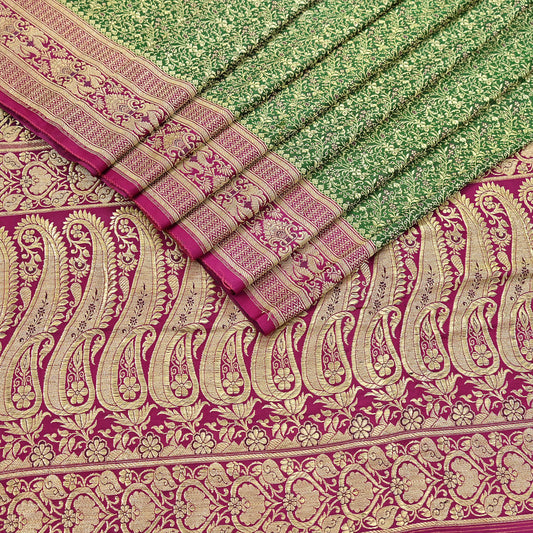 Vintage Banarasi Silk Saree Green & Purple Heavy Satin Silk Brocade Fabric Golden Zari Bridal Wedding Crafting 5Yard