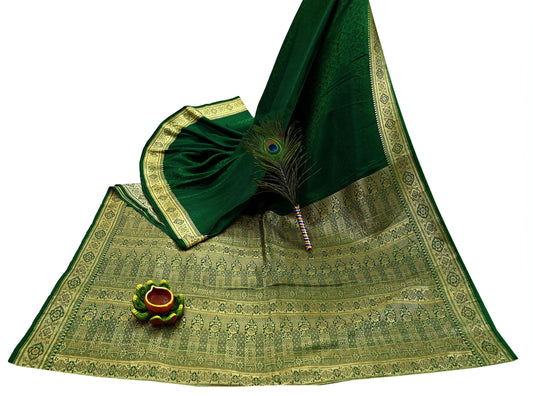 Indian Vintage Green Banarasi Brocade Saree | Heavy Wedding Sari in Pure Satin Silk | Woven Zari Fabric for Crafting, Dressmaking & Decor
