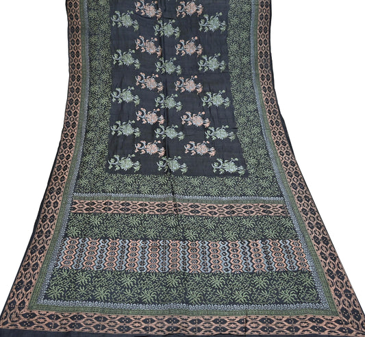 Indian Vintage Sari Black 100% Pure Tussar Silk Hand Painted Sarees 5yd Sewing Craft Fabric Dress Making Soft Woven Border Upcycle Quilting