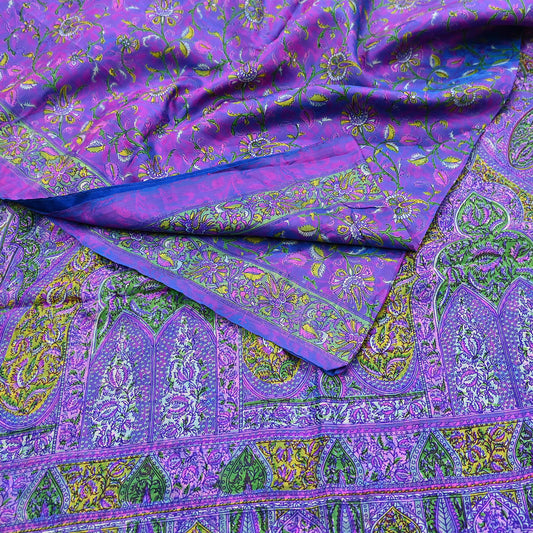 Indian Vintage Sari Purple & Beige Hand Woven Printed Sari 100% Pure Crepe Silk Sarees Craft Fabric 5yd Soft Zari Dress making Quilting Used