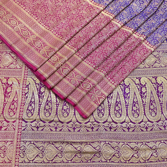 Indian Vintage Heavy Purple & Saffron Kanjivaram Saree 100% Pure Silk Sari Metallic Zari 5Yd Floral Crafting Dress making Ethnic Fringes