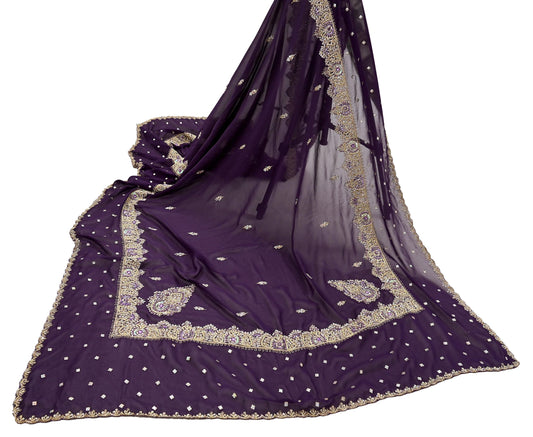 Indian Vintage Heavy Purple Dupatta Georgette Long Stole Hand Embroidered Scarf Zari Zardozi Wedding/Bridal Veil Hijab
