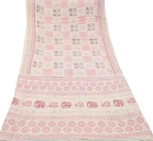 Indian Vintage Sari Ivory Printed Pure Cotton Sarees 5Yd Craft Fabric Soft Sewing Sarong Wrap Boho Upcycle quilting Dress making