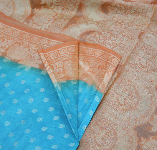Indian Vintage Sari Blue & Saffron Pure Tussar Silk Hand Woven Sarees Fabric 5Yard Sewing Coarse Ethnic