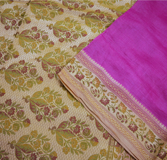Indian Vintage Sari Magenta Pure Tussar Silk Hand Woven Sarees Craft Fabric 5Yard Sewing Ethnic Floral