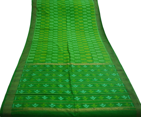 Indian Vintage Greenn Pure Silk Hand Woven Ikat Saree Indian Sari Craft Fabric 5Yard Zari Ethnic Premium Saree