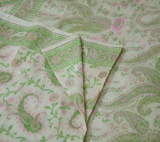 Indian Vintage Sari Ivory & Green Pure Silk Printed Saree 5yd Sewing Craft Fabric Soft DressMaking Abstract Quilting Crafting Used Upcycle