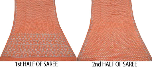 Indian Vintage Sari Orange Pure Chiffon Silk Printed Sarees 5Yd Craft Fabric Sewing Soft Light Sari Dress Making Golden Zari Border Quilting