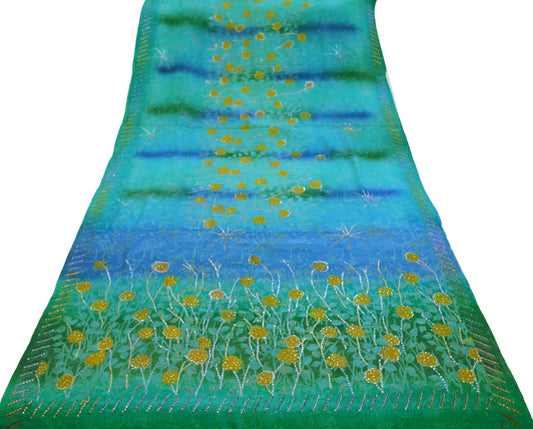 Indian Vintage Sari Blue Pure Crepe Silk Hand Embroidered Saree 5yard Sewing Floral Craft Sequins