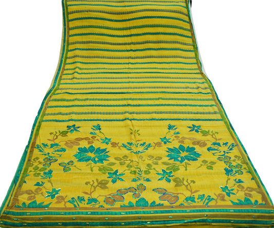 Indian Vintage Sari Yellow Pure Crepe Silk Hand Embroidered Saree 5yard Sewing Floral Craft Sequins