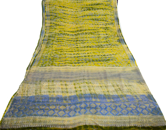 Indian Vintage Sari Green & Yellow Pure Chiffon Silk Leheria Printed Sarees Sewing 5yd Soft Craft Fabric Stripes Wrap Boho