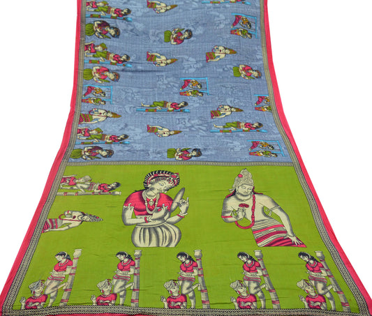 Indian Vintage Sari Green & Gray Printed 100% Pure Cotton Sarees Craft Fabric Soft 5Yd Sewing Sarong Wrap Boho Humans Dress Making Quilting