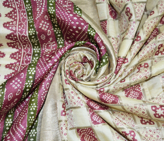 Indian Vintage Deep Maroon & Cream Saree Woven Printed Bandhani Sari 100% Pure Silk Indian Sari Fabric 5yard Soft Floral Golden Zari Craft