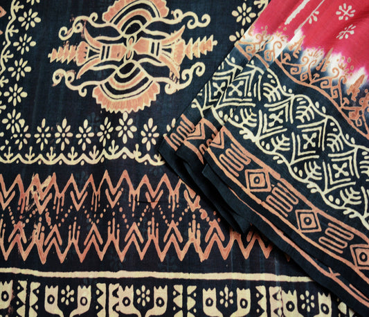Indian Vintage Sari Black & Red Block Printed 5Yd Pure Silk Saree Fabric Floral Soft Dressmakig