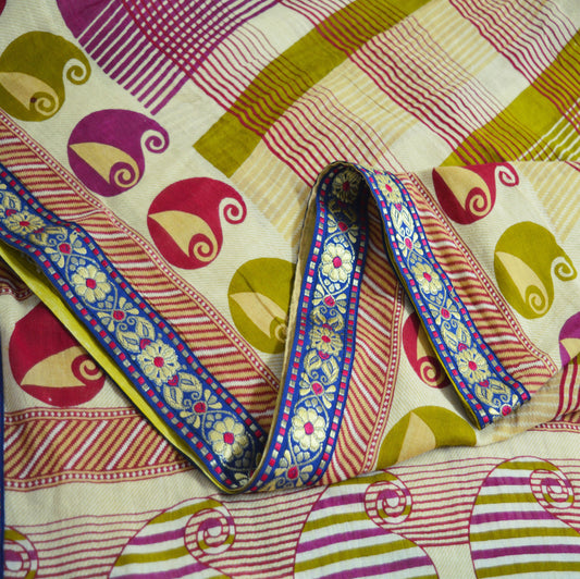 Indian Vintage Ivory Dupatta Long Stole Kalamkari Print Pure Chanderi Silk Indian Scarves Veil Golden Zari