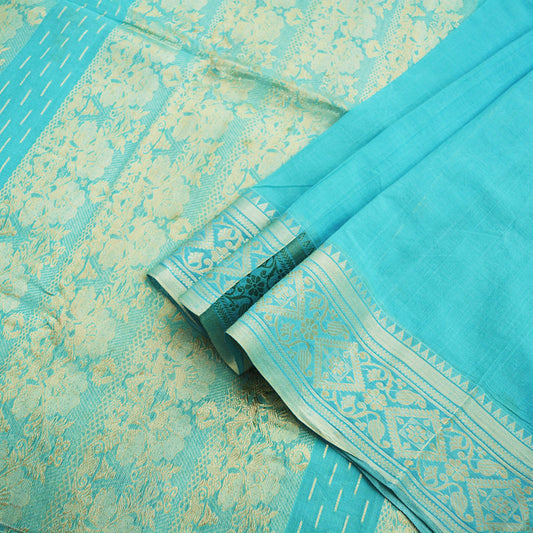 Vintage Sari Blue Pure Cotton Hand Woven Saree Golden Zari 5Yard Soft Floral Golden Zari