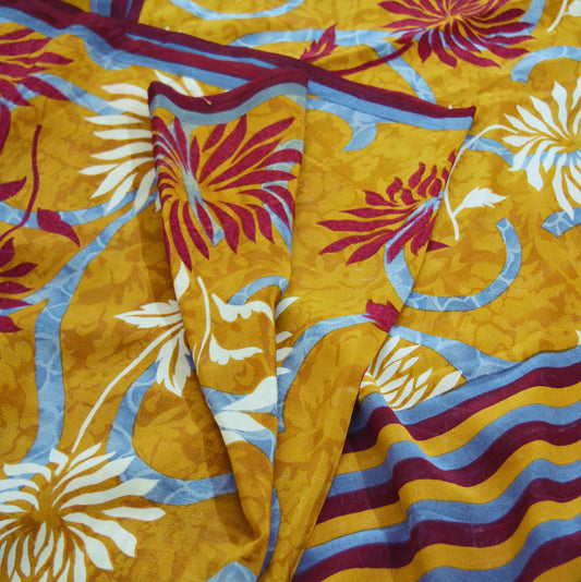 Indian Vintage Sari Yellow Printed 100% Pure Georgette Silk Sarees Sewing 5yd Craft Fabric Soft Dress Designing for Crafting Floral Quilting