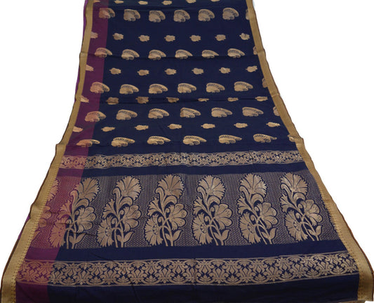 Indian Vintage Sari Blue Pure Silk Hand Woven Sarees Fabric 6Yard Sewing Ethnic Floral