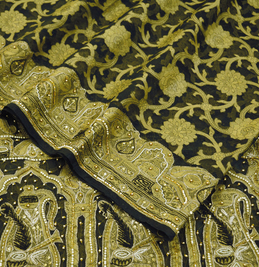 Indian Vintage Sari Black Hand Embroidered Pure Organza Silk Saree Fabric 6Yard Ethnic Floral Fringes zari