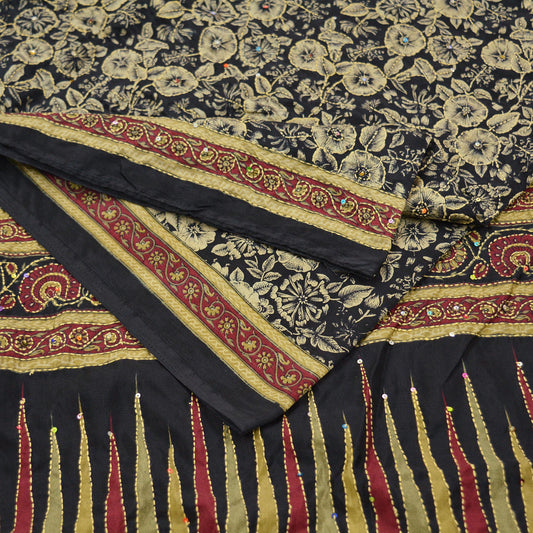 Indian Vintage Sari Black Art Silk Hand Embroidered Kantha Sarees 5yd Craft Fabric Ethnic Sewing Floral Soft Sequins Quilting Crafting Used