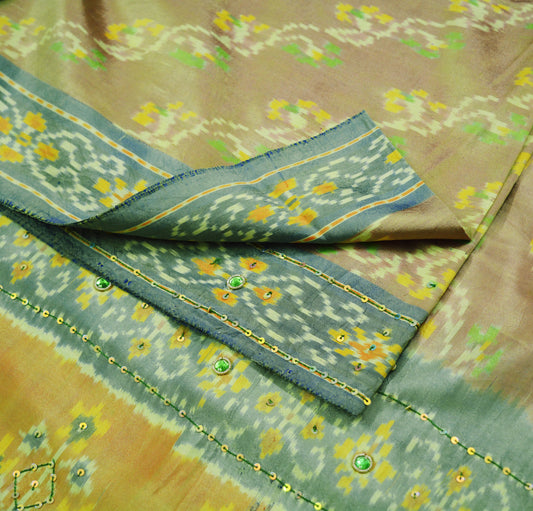 Indian Vintage Sari Green & Peach Pure Georgette Silk Printed Saree Mukesh work Sewing 5yd Craft Soft Dress Designing for Crafting