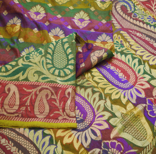 Vintage Sari Multi Hand Woven Art Silk Saree Metallic Golden Zari 5Yard Floral