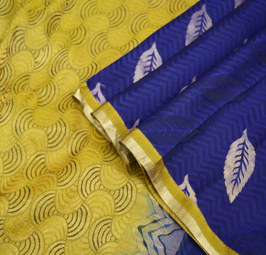 Indian Vintage Saree Saffron & Blue Hand Woven Pure Silk Indian Sari Fabric 5Yard Silk Sari Ethnic Floral Golden Zari Fringes