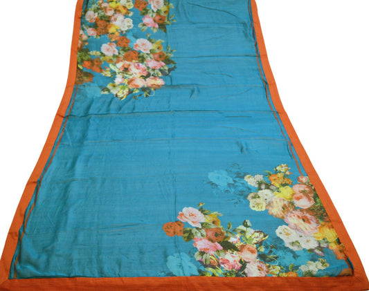Indian Vintage Sari Saffron & Blue 100% Pure Silk Printed Saree Fabric 5yd Sewing Craft Fabric DressMaking Floral