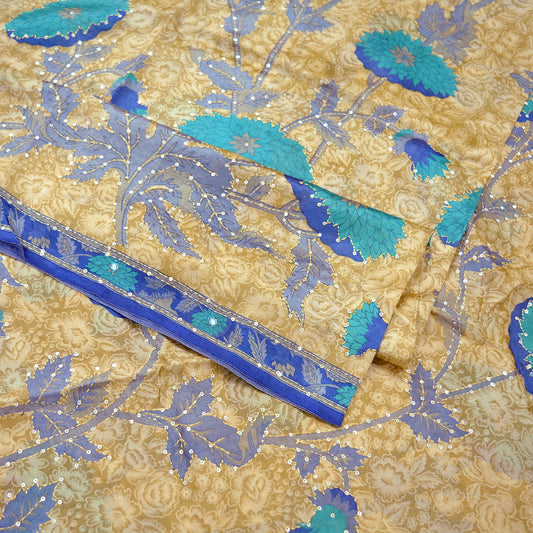 Indian Vintage Sari Beige 100% Pure Silk Hand Embroidered Kantha Sarees Craft Fabric 5yd Sewing Floral Sequins Upcycle Quilting Crafting