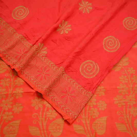 Indian Vintage Sari Red & Orange Pure Silk Hand Woven Saree Fabric 5Yard Sewing Ethnic Floral