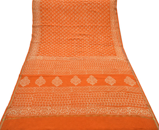 Indian Vintage Sari Orange Pure chanderi Silk Block Printed Sarees Fabric 5Yard Soft Zari Border Floral Dress making bollywood silk sarees