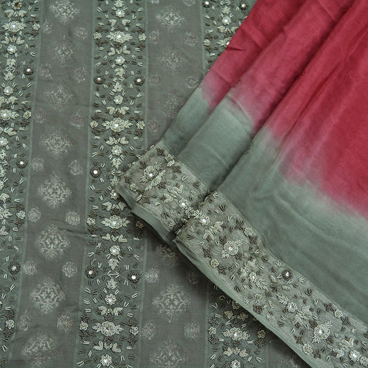 Indian Vintage Sari Pink & Gray Pure Crepe Silk Hand Embroidered Sarees Craft Fabric 6yd Sewing Soft Ethnic Zardozi Dress Making Crafting