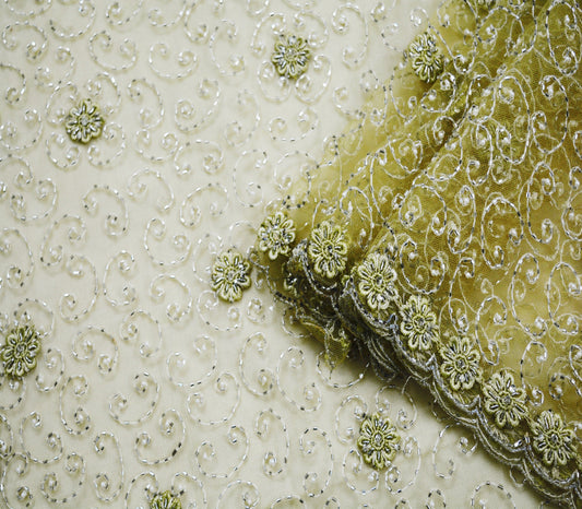 Indian Vintage Yellow Saree Net/Mesh Hand Embroidered Indian Sari Fabric 6Yd Sewing Soft Silver Zardozi/Dabka Zari Sequins