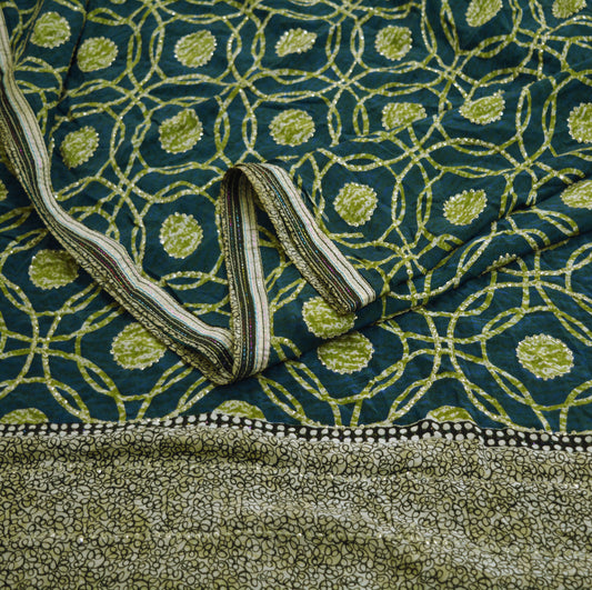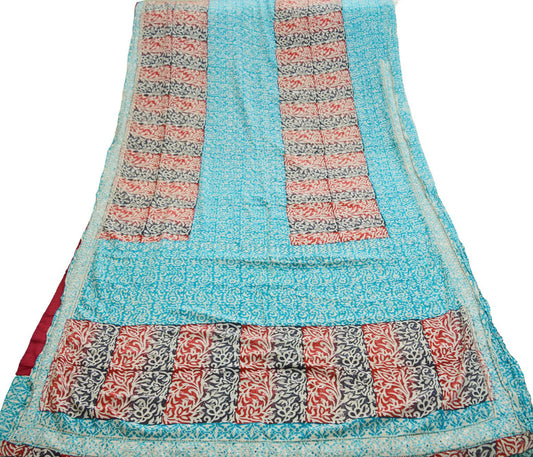 Vintage Sari Blue & Green 100% Pure Satin Silk Printed Saree Fabric 5yard Sewing Soft Dress Designing for Crafting