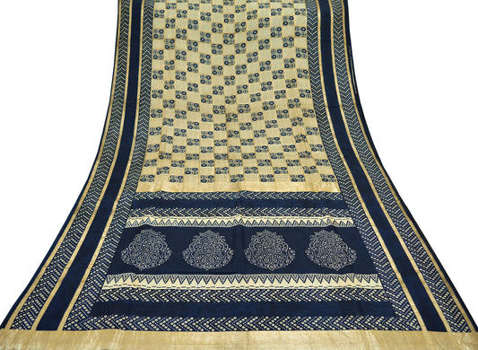Indian Vintage Sari Blend Silk Printed Sarees Craft Fabric 5Yd Floral Soft Golden Zari Dress making Crafting Quilting Upcycle Zari