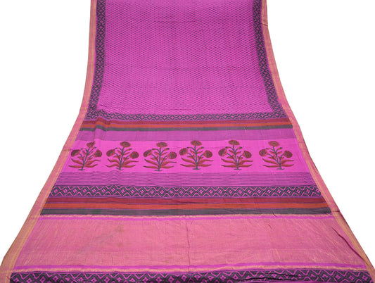 Indian Vintage Sari Purple Pure chanderi Silk Block Printed Sarees Craft Fabric 6Yd Soft Zari Border Floral Dress making bollywood sarees