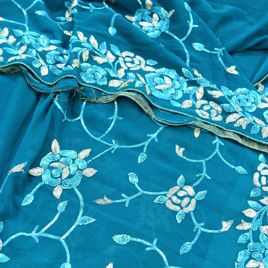Indian Vintage Heavy Sari Blue Pure Georgette Silk Hand Beaded Sarees Craft Fabric 6Yd Sewing Ethnic Zardozi/ Dabka Wedding Sarees