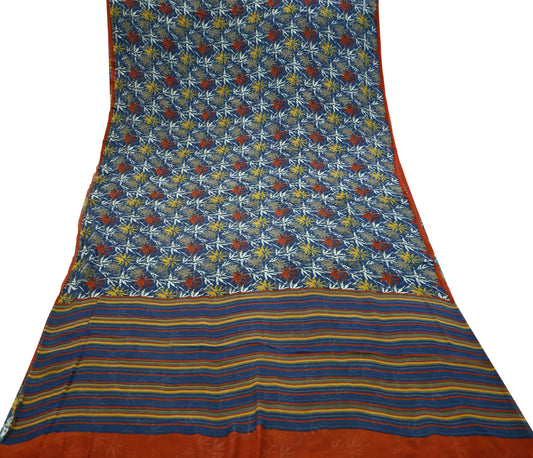Indian Vintage Blue Pure Georgette Silk Saree | 5 Yards | Printed Floral & Stripes | Soft Sheer Fabric for Sewing, Dressmaking, Crafting