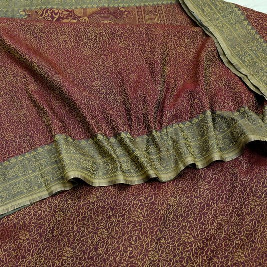 Indian Vintage Heavy Maroon Banarasi Saree | 5 Yards Pure Satin Silk | Woven Brocade Zari Floral| Pure Metallic Zari Fabric for Dressmaking