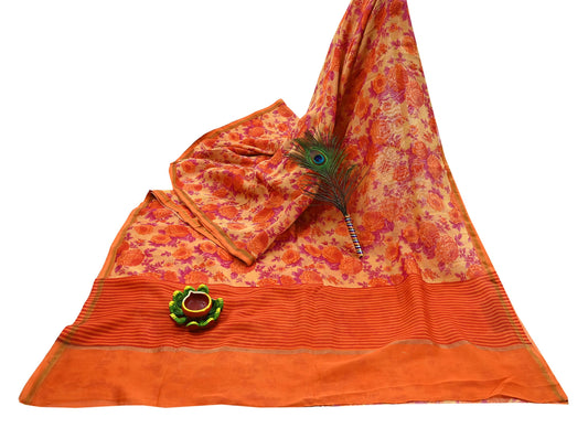 Indian Vintage Saree Beige Moss Crepe Printed Sari | 5 Yards | Floral Soft Fabric for Sewing, Dressmaking, Crafting, Quilting