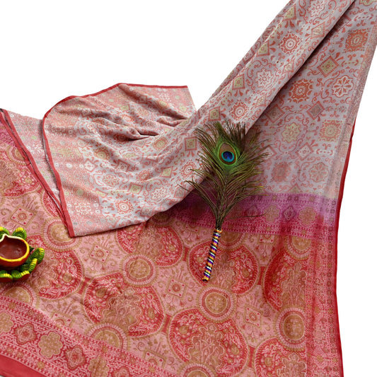 Indian Vintage Pink Dupatta Long Stole Woven Cotton Scarves Veil Golden Zari Soft Floral Design Wrap Boho Upcycle For Designing