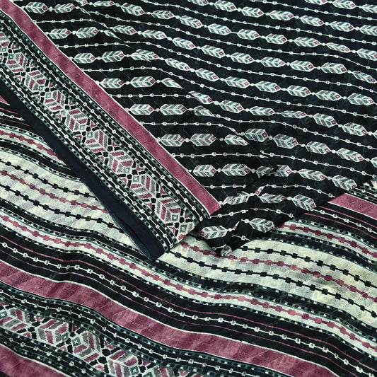 Indian Vintage Black Pure Silk Saree | Printed Floral & Striped Design | 6 Yards | Soft Craft Fabric for Dressmaking, Quilting, Upcycling