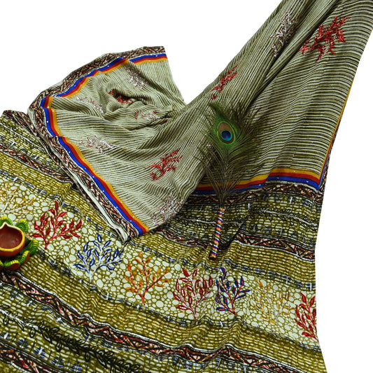Indian Vintage Green Dupatta Long Stole Pure Chiffon Silk Hand Embroidered Bagh Phulkari Stole Scarves Golden lace