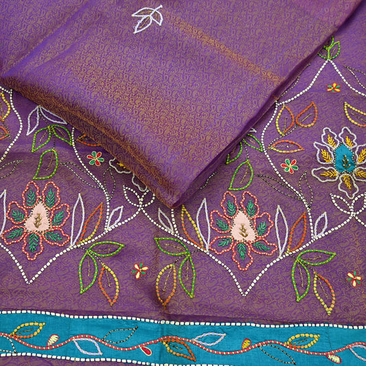 Indian Vintage Sari Purple Hand Embroidered Saree Pure Organza Silk Craft Fabric 5Yd Ethnic Dress Making Crafting Quilting