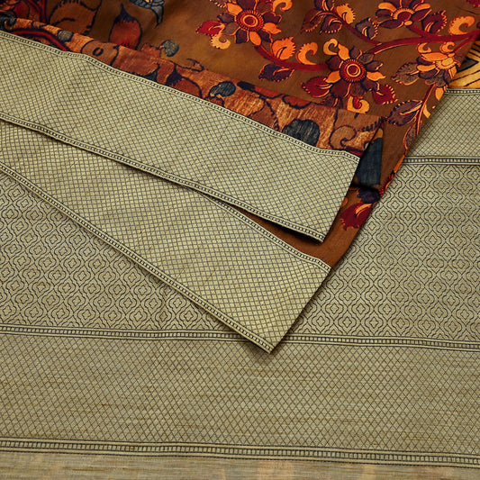 Indian Vintage Brown Saree Blend Silk Kalamkari Sari Craft Fabric 5yd Ethnic Wear Floral Crafting Quilting Peacock Design