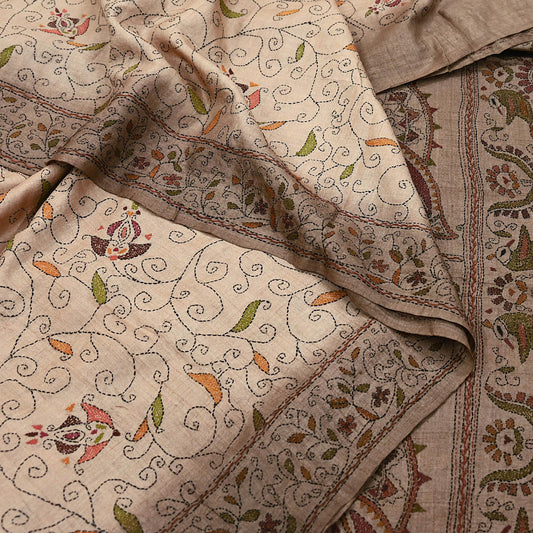 Indian Vintage Beige & Brown Saree 100% Pure Silk Hand Embroidered Kantha Sari Fabric 5Yd Sewing Floral Sequin