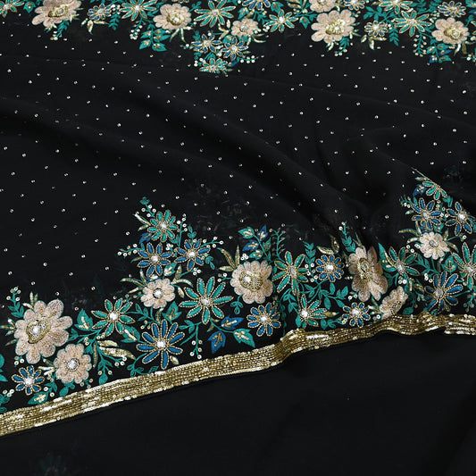 Indian Vintage Heavy Sari Black Pure Georgette Silk Hand Beaded Sarees Craft Fabric 5Yd Sewing Soft Ethnic Wedding Heavy Sarees Dress making