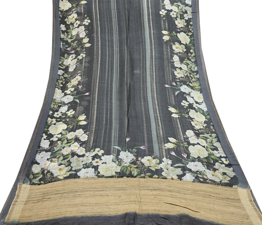 Indian Vintage Saree Gray Pure Khadi Silk Handloom Digital Printed Sari Craft Fabric 5yard Ethnic Wear Sari Dress making Crafting Upcycle