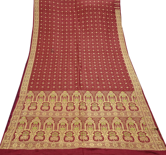 Vintage Maroon Banarasi Silk Saree Pure Satin Silk Handwoven Tanchoi Fabric with Floral Weave 5 Yard Dressmaking Craft Material